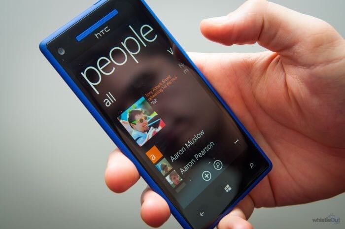 HTC Windows phone in blue, works perfectly, unlocked comes with box, charger, new clear rubber case.