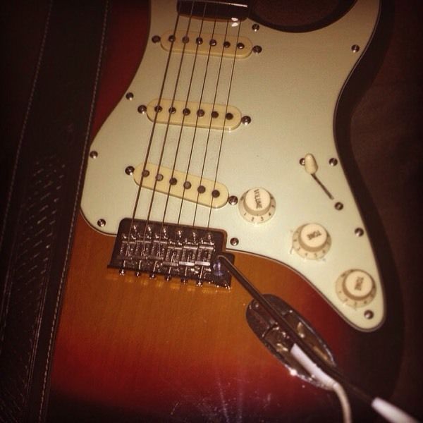 Sunburst stratocaster with aged pickguard.