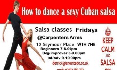 Friday salsa night upstairs at the Carpenters Arms in central London with Encantado..Derrick teaching Cuban style with New York cross body.Absolute beginners7.00 – 8.00pm Beginners/Improvers 8.00 – 9.00pm,int/adv 9.00 – 10.00pm.Club dancing till 11.00pm. £7. one class £10 two classes.